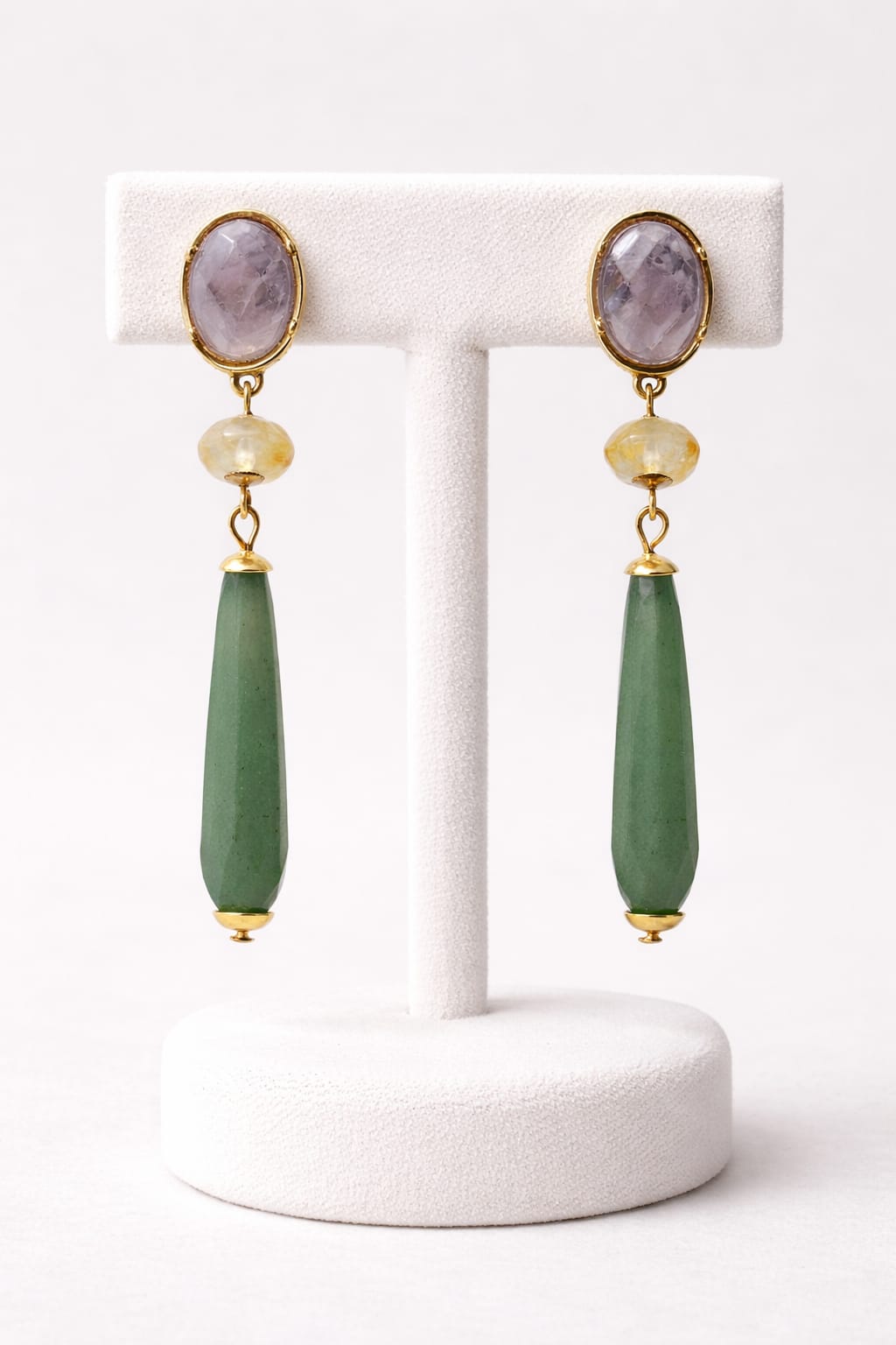Feitos com materiais de alta qualidade, os brincos oferecem durabilidade e conforto para uso prolongado. Não perca a oportunidade de adquirir esta joia única que une a beleza das ametistas, quartzo rutilado e quartzo verde em uma composição perfeitamente equilibrada.