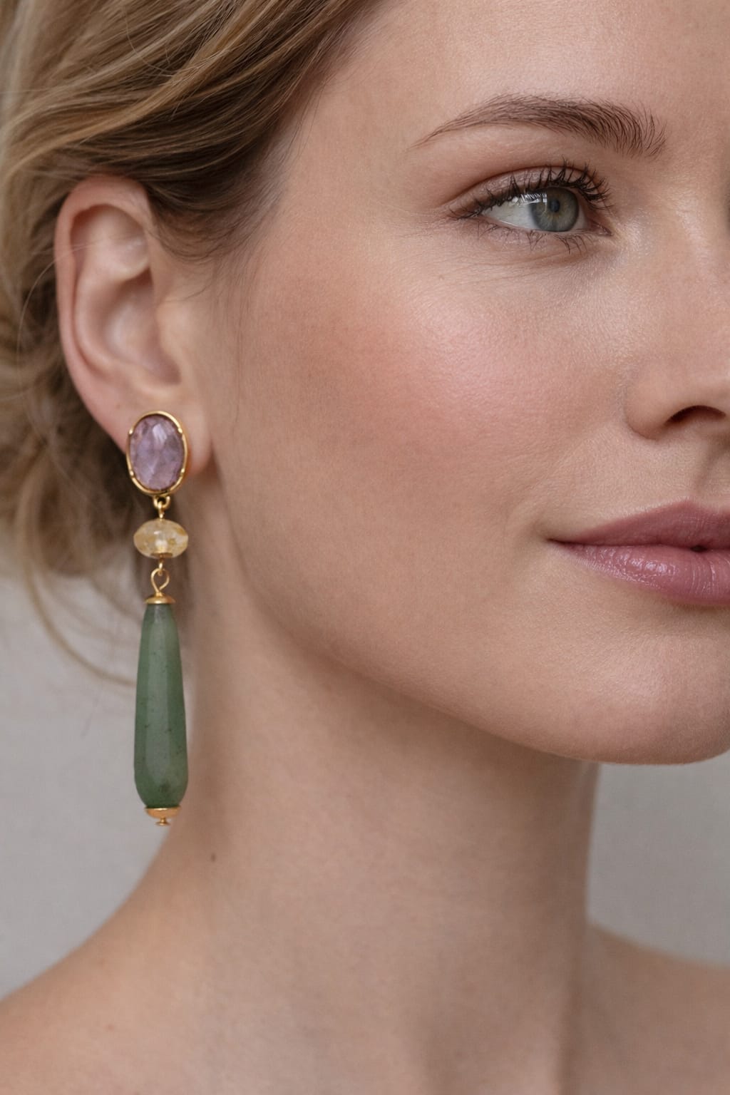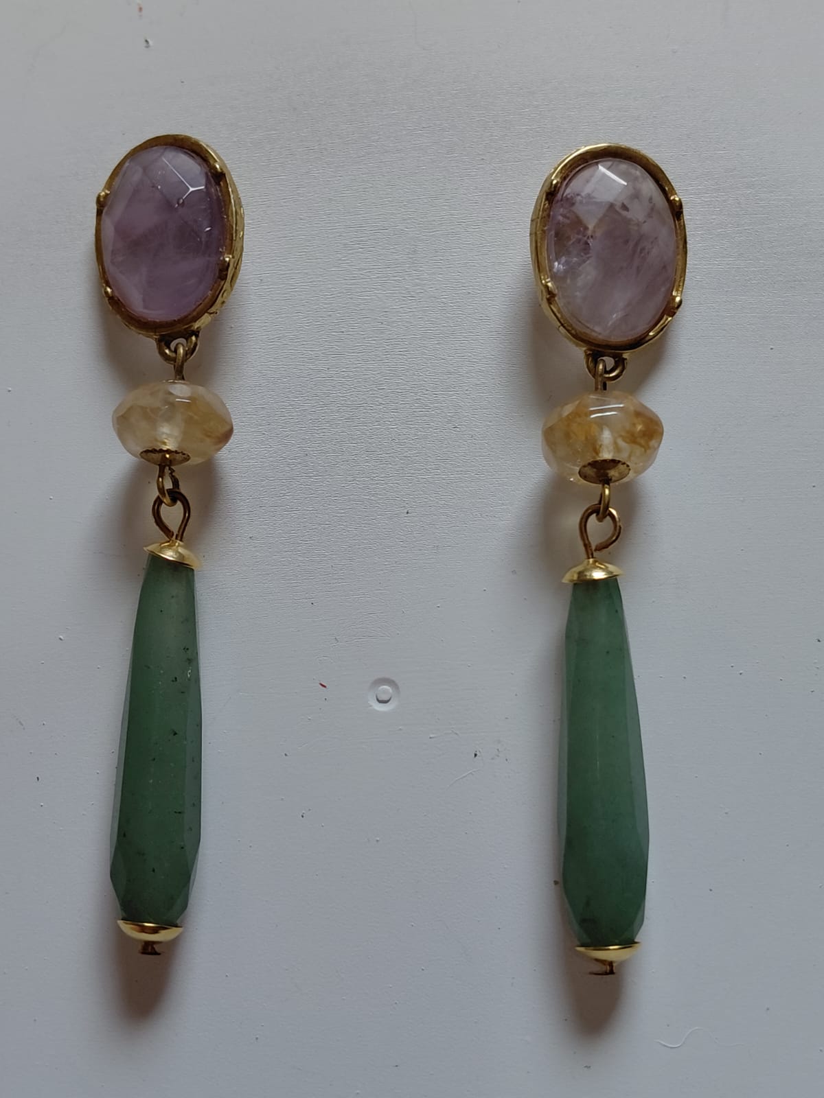 Adicione um toque de elegância ao seu visual com estes brincos deslumbrantes que combinam ametistas, quartzo rutilado e quartzo verde. Cada peça é meticulosamente projetada para realçar a beleza natural das pedras preciosas, tornando-a ideal tanto para ocasiões especiais quanto para uso diário. Um presente perfeito para quem aprecia o brilho e o encanto das joias genuínas.