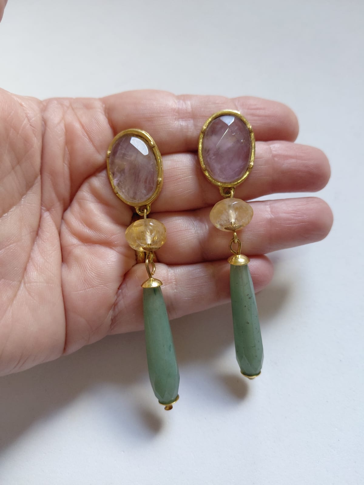 Brincos de Ametistas Quartzo Rutilado e Quartzo Verde