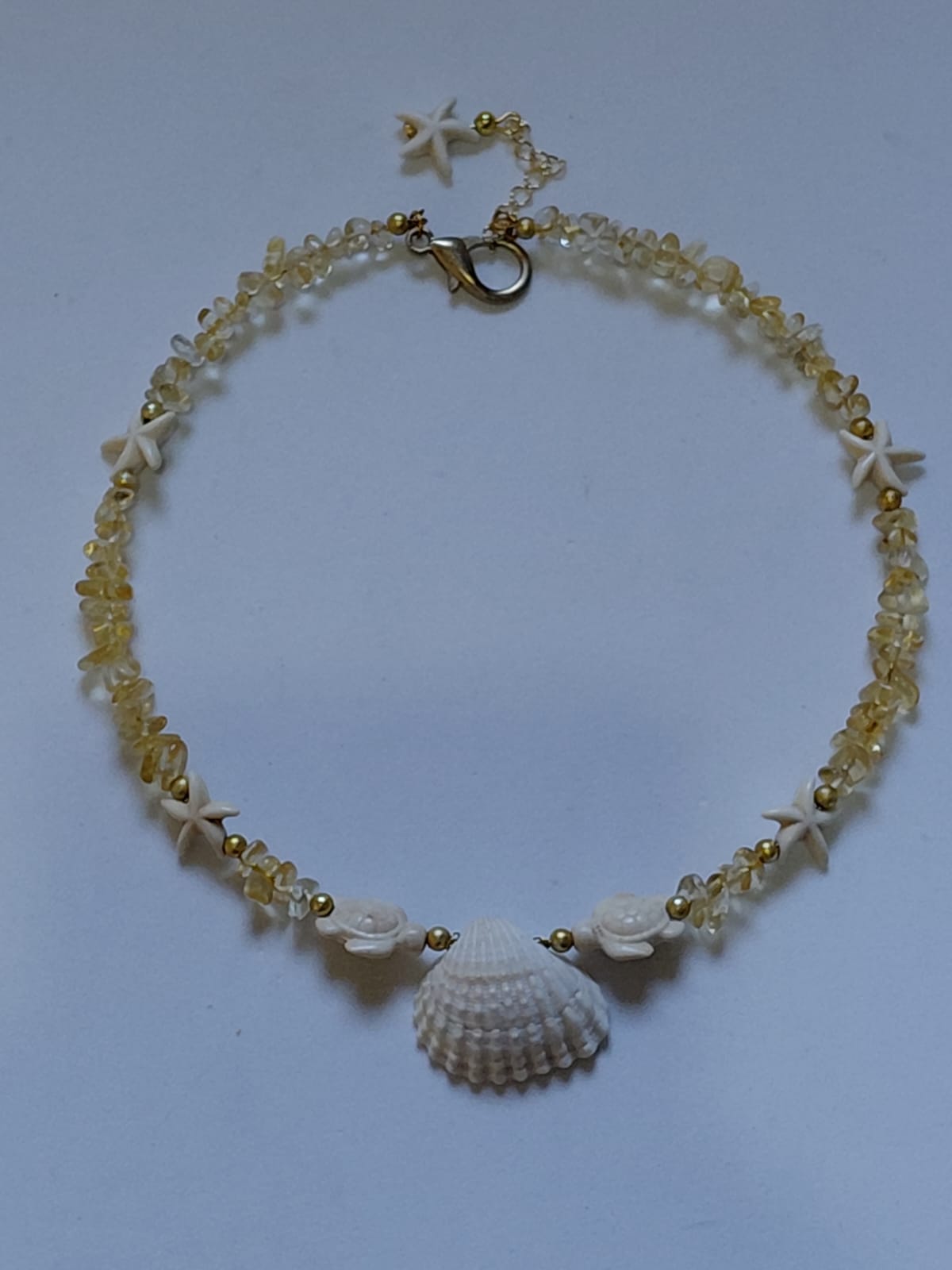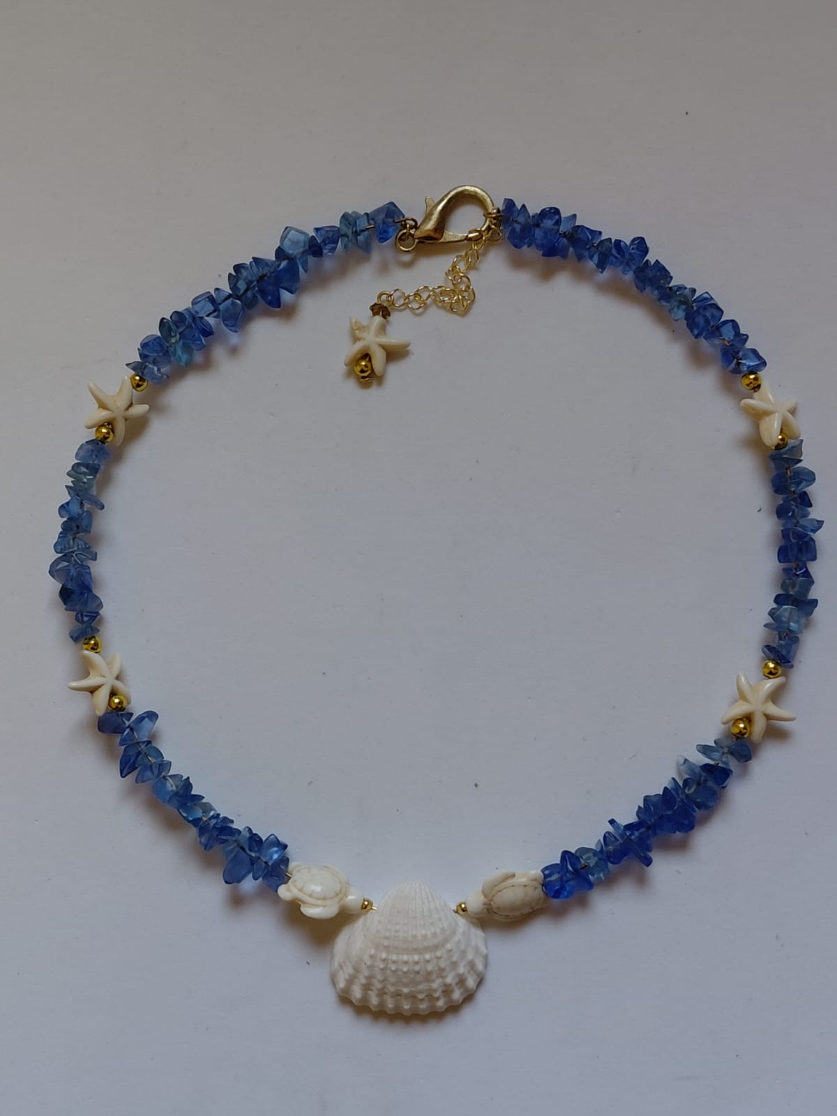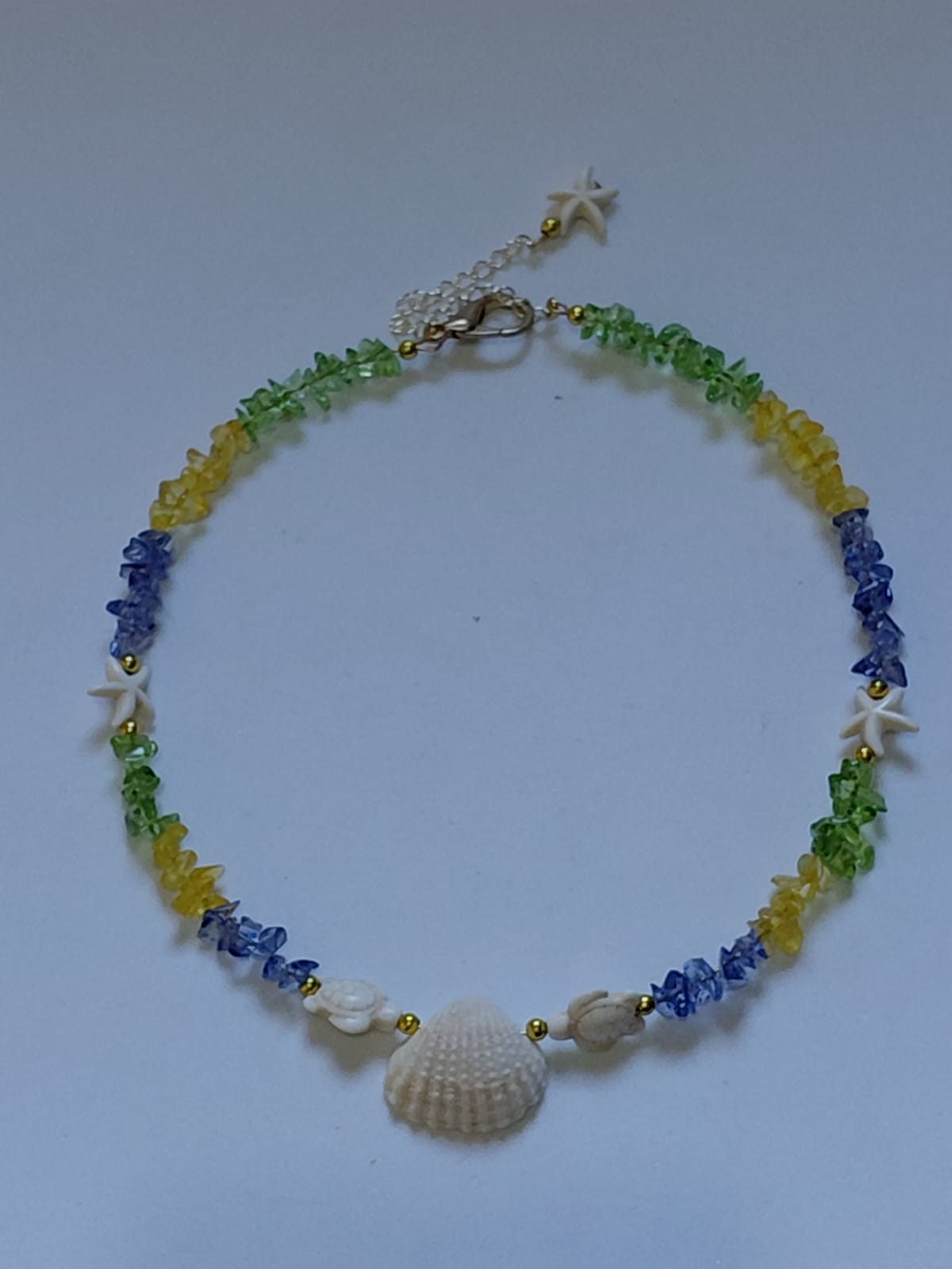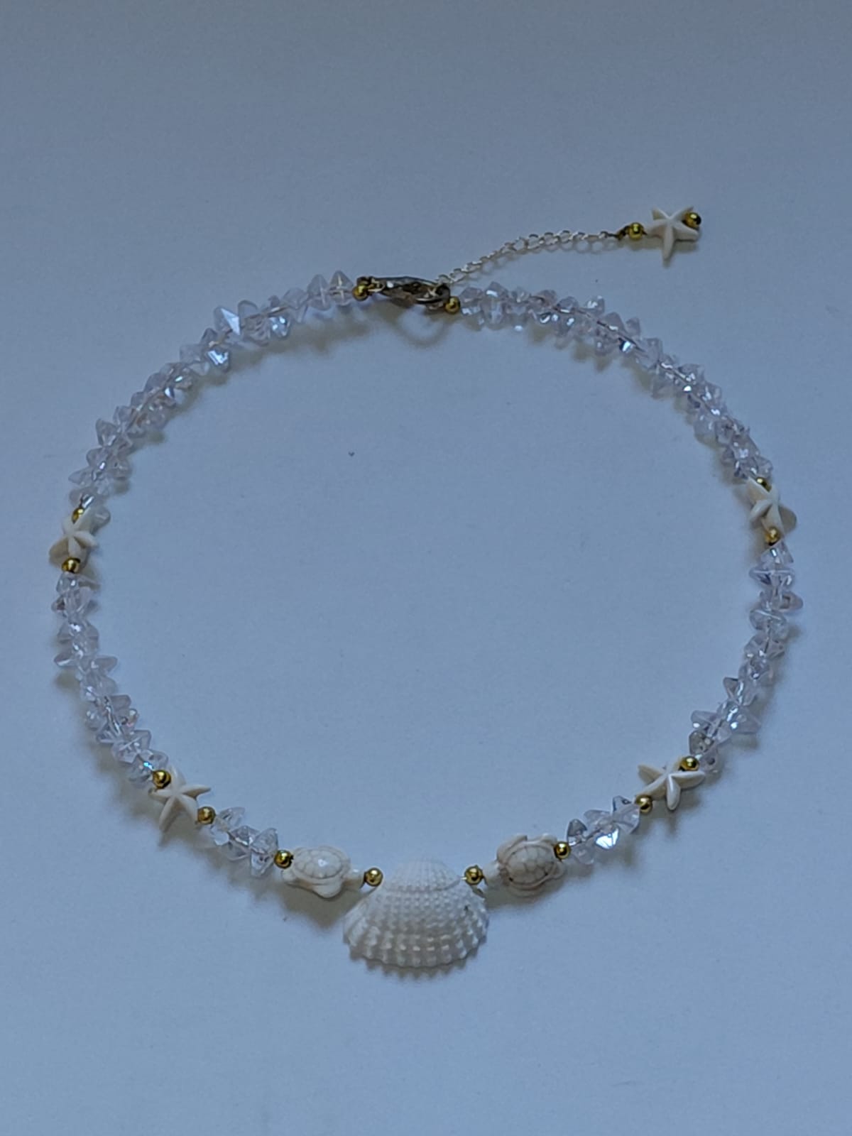 Este choker rígido é construído com um delicado cascalho de muranos, que adiciona textura e profundidade ao design. O destaque central da peça é uma concha natural, conferindo autenticidade e um toque orgânico à essência do colar. Para complementar a sua estética natural, a peça inclui detalhes encantadores como uma estrela feita de howlitas brancas e tartarugas também elaboradas em howlitas brancas. Todos esses elementos se unem para criar um visual harmônico que captura a beleza da natureza com um toque moderno.