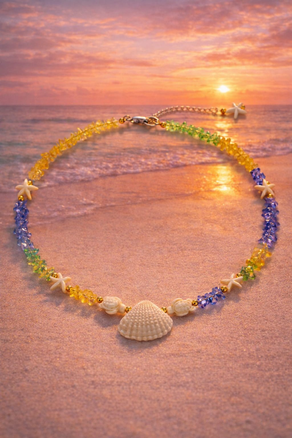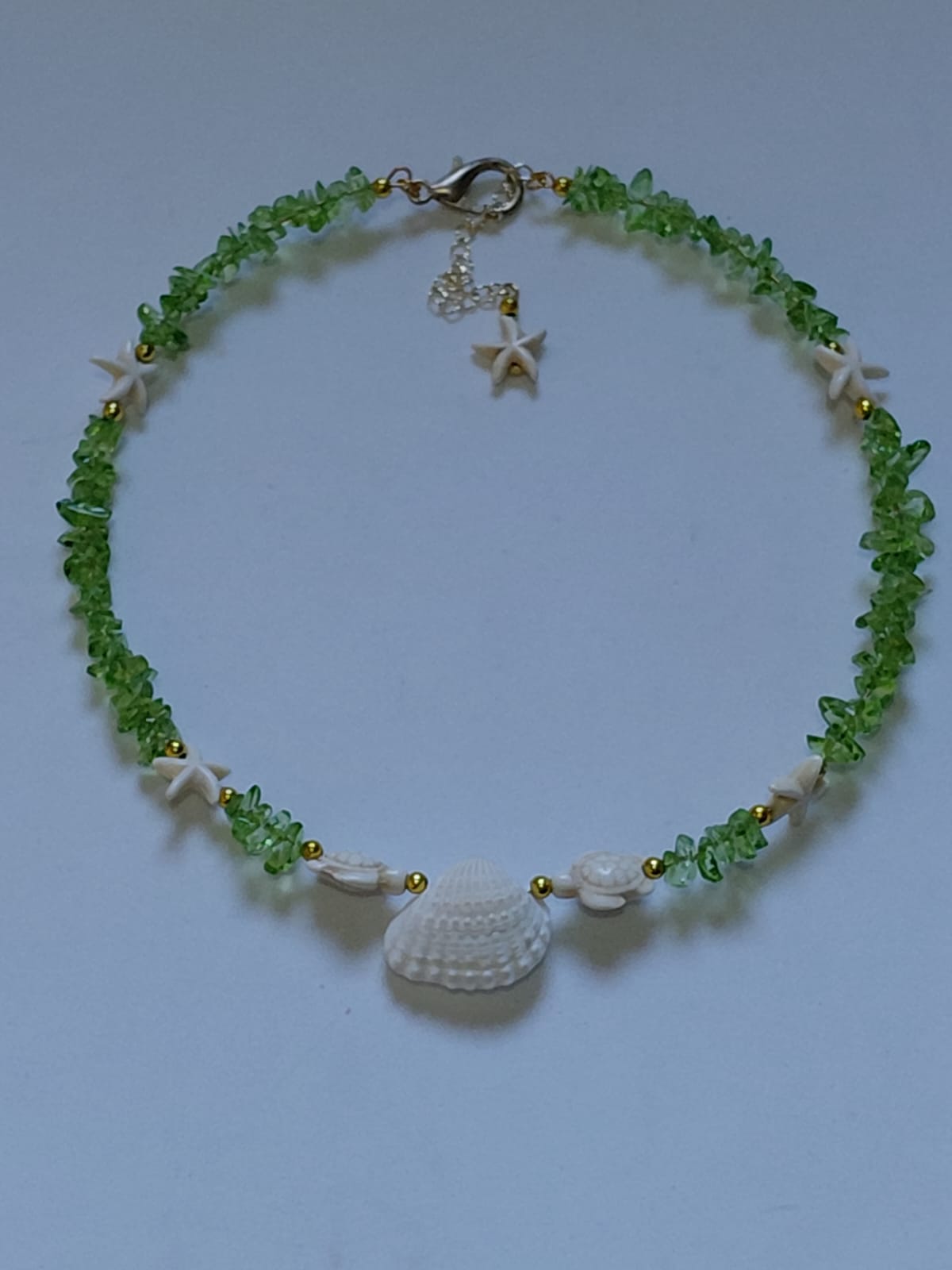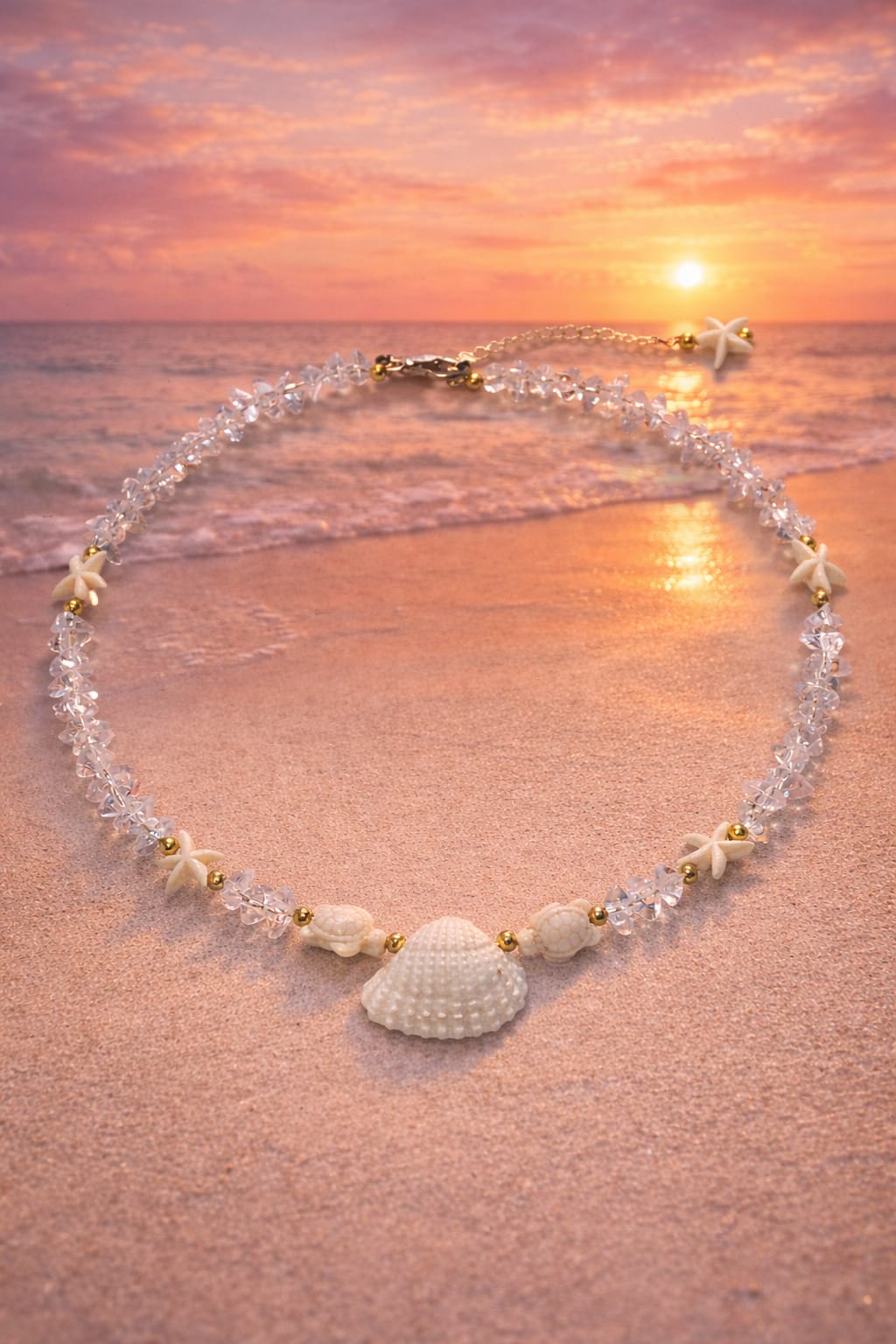 Este choker rígido é construído com um delicado cascalho de muranos, que adiciona textura e profundidade ao design. O destaque central da peça é uma concha natural, conferindo autenticidade e um toque orgânico à essência do colar. Para complementar a sua estética natural, a peça inclui detalhes encantadores como uma estrela feita de howlitas brancas e tartarugas também elaboradas em howlitas brancas. Todos esses elementos se unem para criar um visual harmônico que captura a beleza da natureza com um toque moderno.