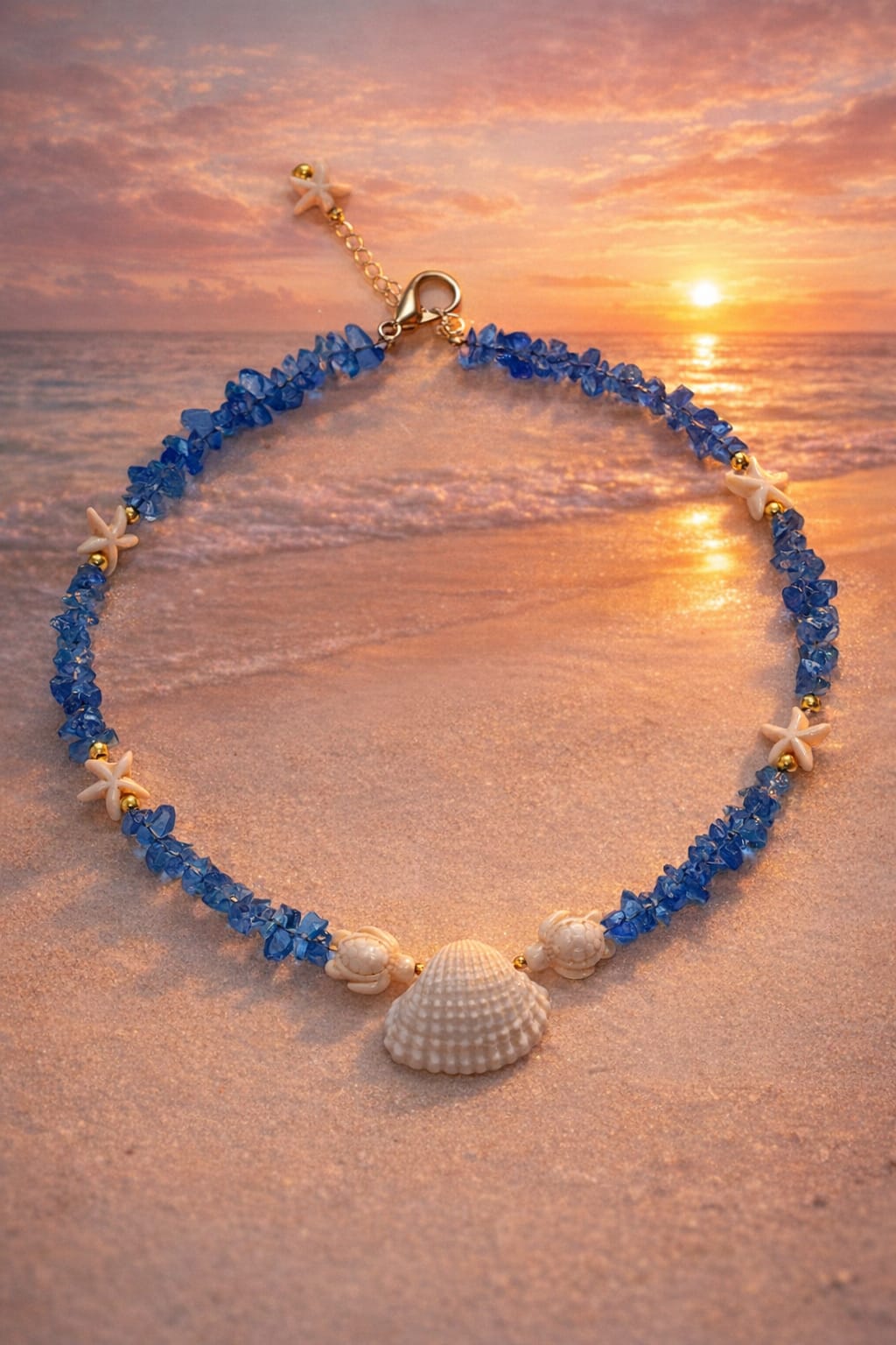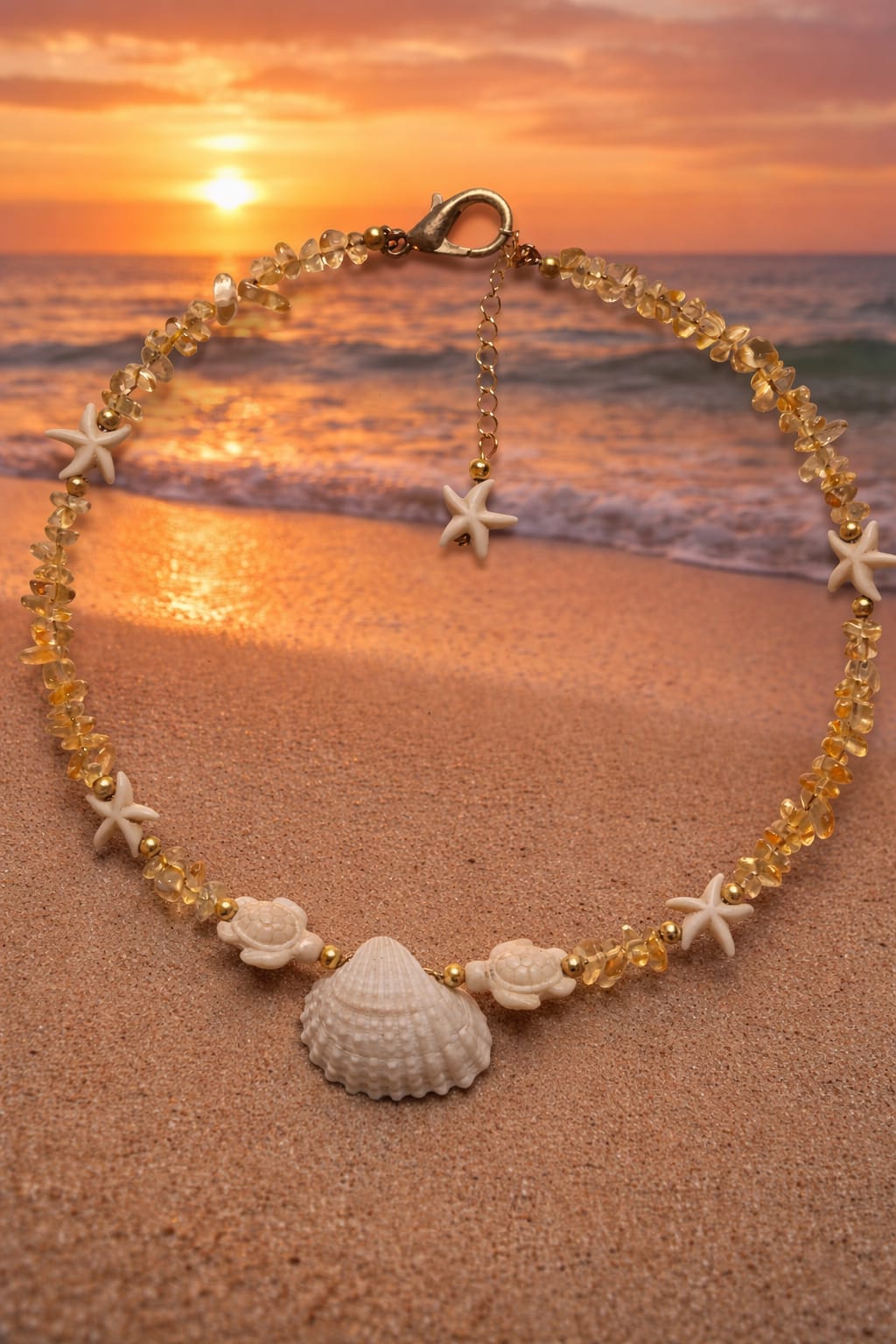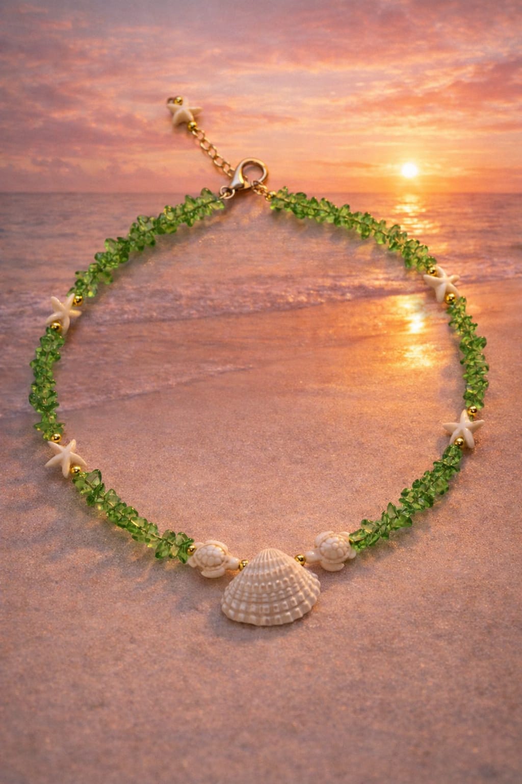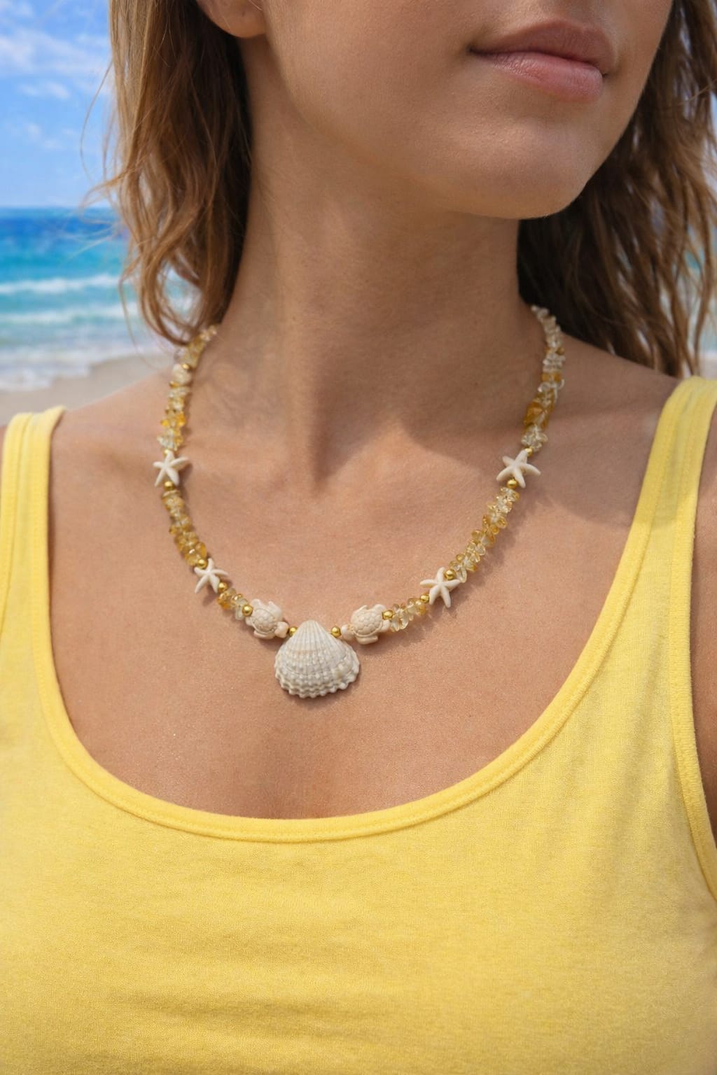 Este choker rígido é construído com um delicado cascalho de muranos, que adiciona textura e profundidade ao design. O destaque central da peça é uma concha natural, conferindo autenticidade e um toque orgânico à essência do colar. Para complementar a sua estética natural, a peça inclui detalhes encantadores como uma estrela feita de howlitas brancas e tartarugas também elaboradas em howlitas brancas. Todos esses elementos se unem para criar um visual harmônico que captura a beleza da natureza com um toque moderno.