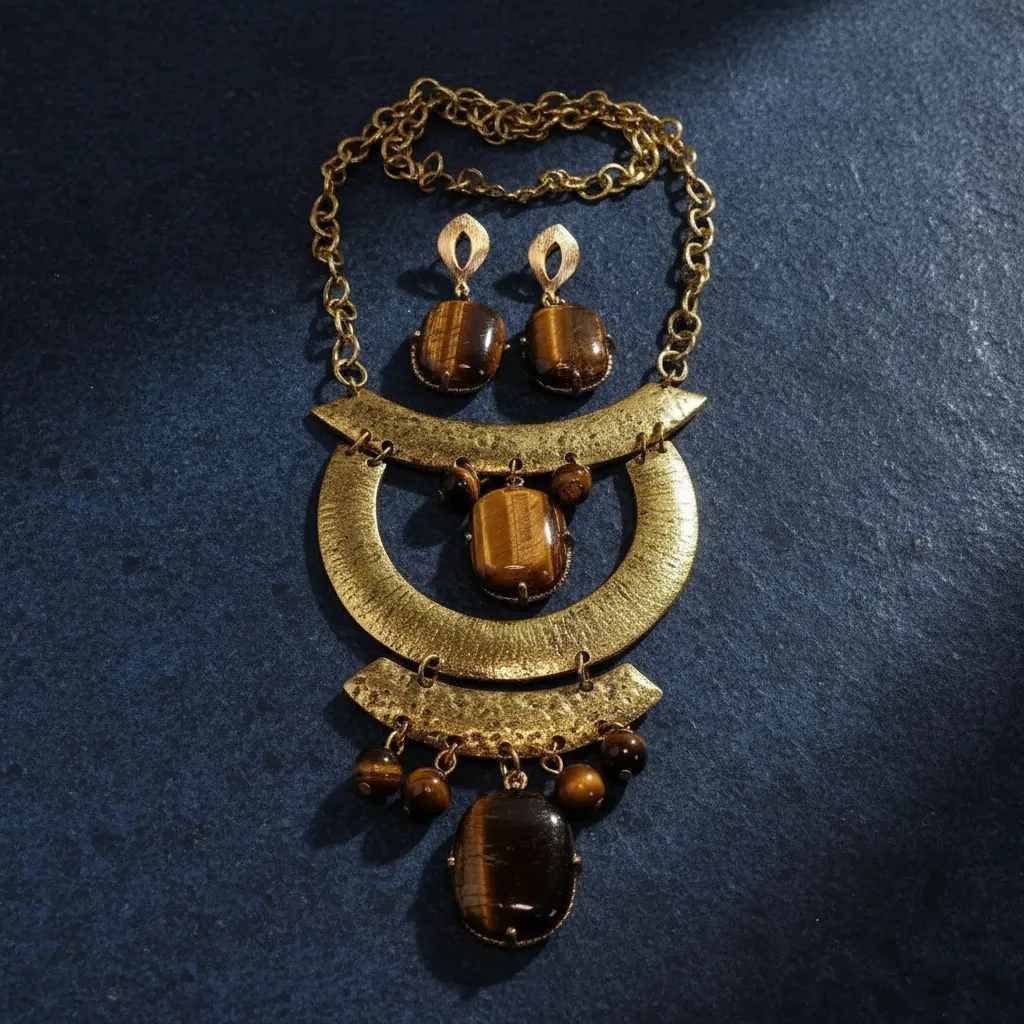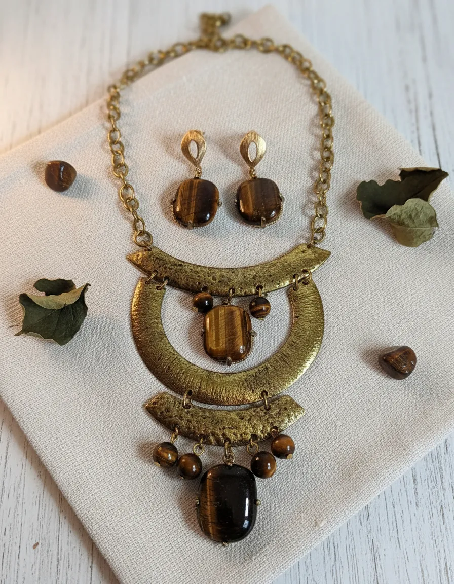 Colar Pedras Olho De Tigre E Brincos Estilo Oriental Marrom