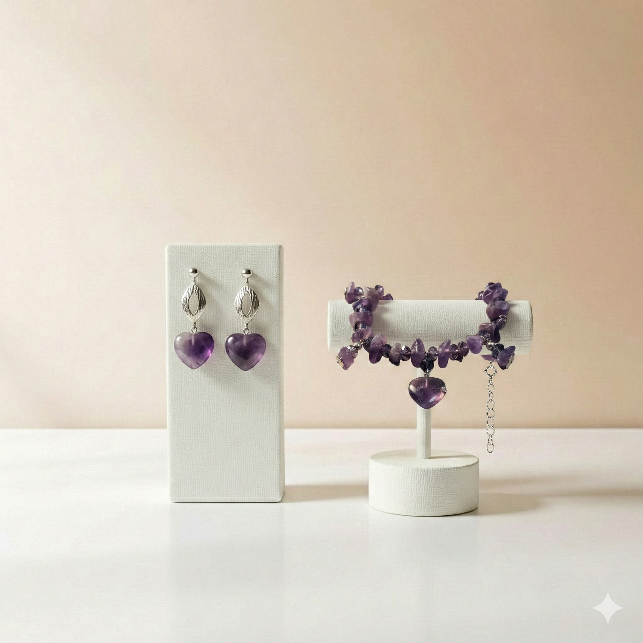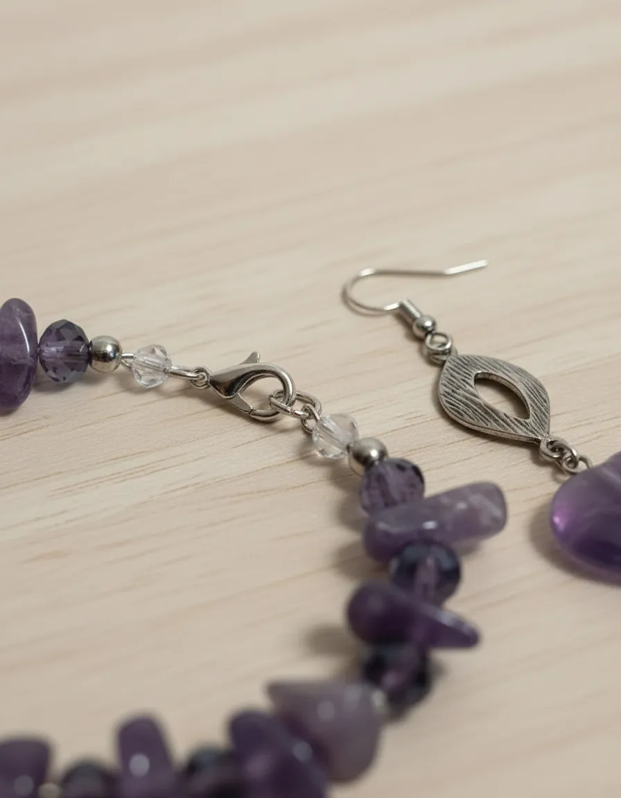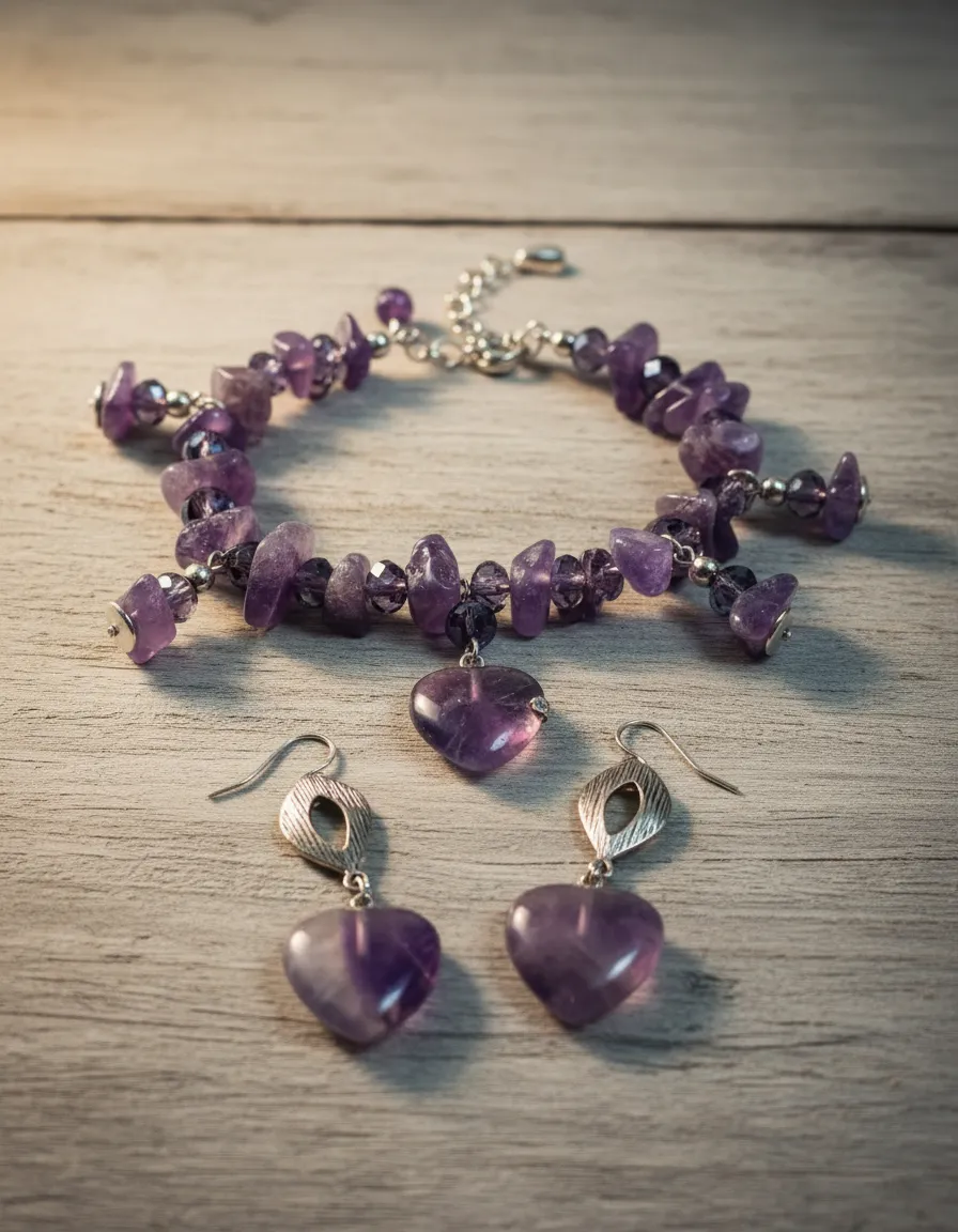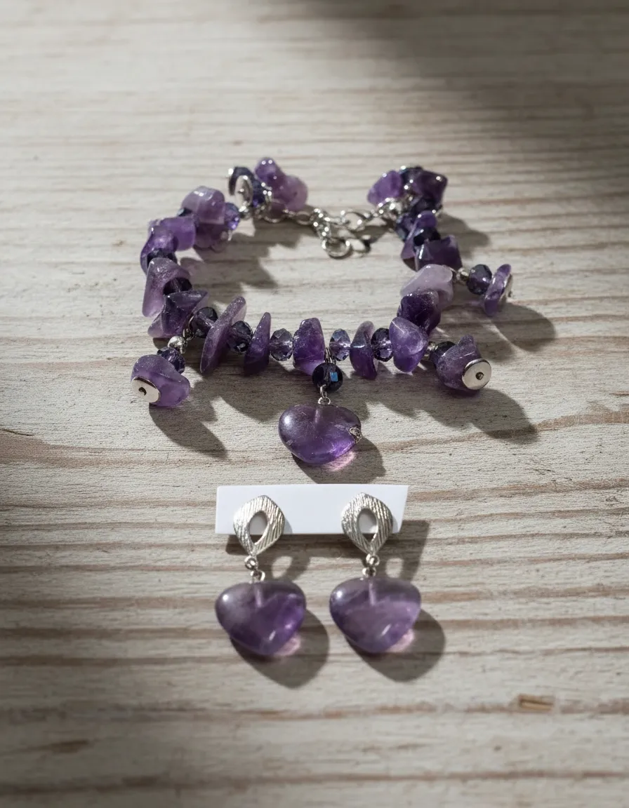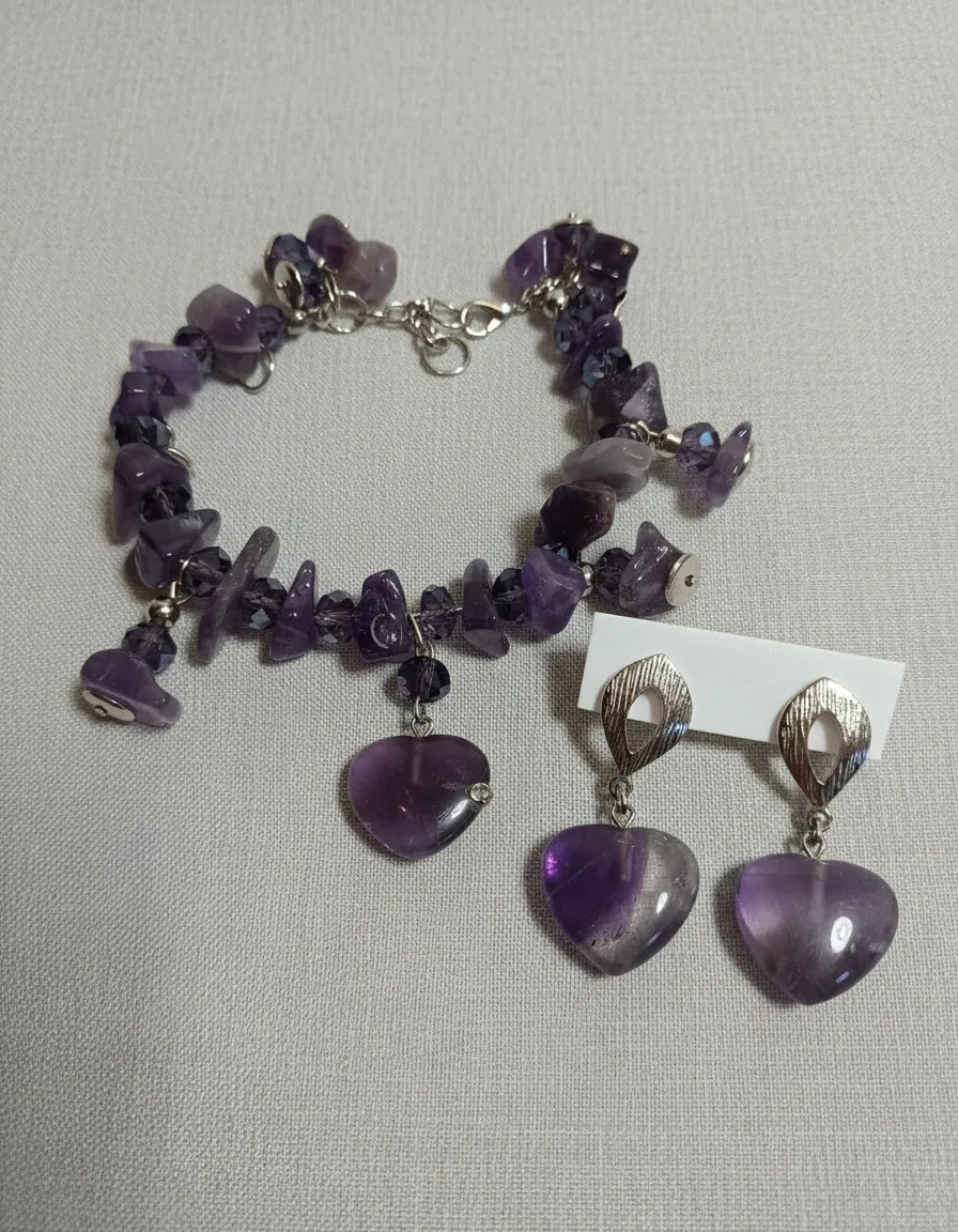Transforme o seu look diário com a nossa pulseira e brincos de pedras naturais, elaborados com ametistas vibrantes e cristais cintilantes. Cada peça foi cuidadosamente projetada para exaltar sua elegância e oferecer um toque de sofisticação em qualquer ocasião. As ametistas, conhecidas por suas propriedades calmantes, combinam harmoniosamente com cristais reluzentes, criando acessórios que são ao mesmo tempo deslumbrantes e funcionais. Seja no trabalho, em encontros casuais ou em eventos especiais, este conjunto de joias naturais trará destaque e estilo à sua imagem.